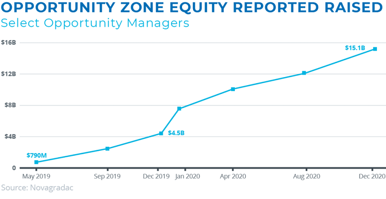 More recently, there has been rapid acceleration in the size of the OZ market. Novogradac’s voluntary survey of opportunity fund managers seeking to raise capital reported $15.1 billion raised in December 2020, up from $4.5 billion one year prior and demonstrating a significant increase. Opportunity funds not raising outside capital are excluded from these figures.